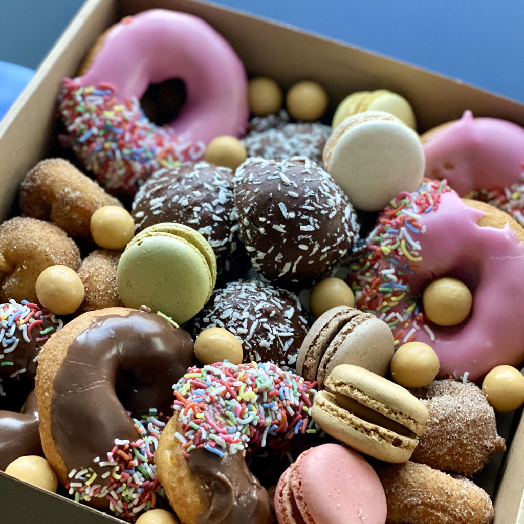 Selection of local made macaroons, mini cupcakes, confectionery, donuts, chocolate, slices.