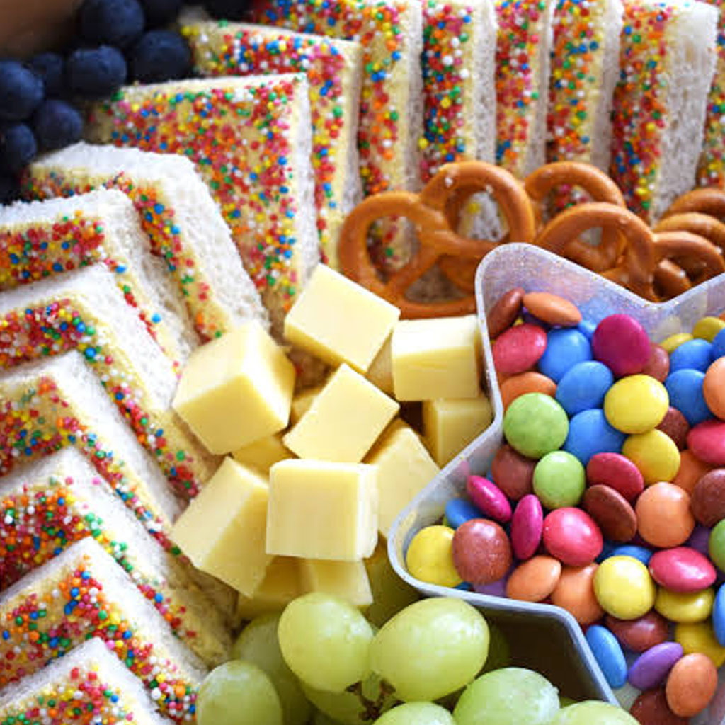 Cheese and ham finger sandwiches, fairy bread, fresh fruit, cheese, salami, lollies, biscuits, dip and veg sticks. Please Note: Selection of produce is subject to seasonal availability.